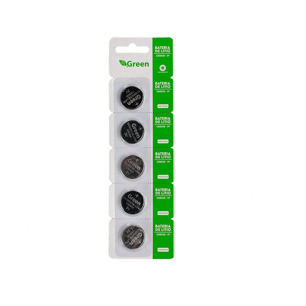 | Dados Técnicos | • Tipo de Bateria: CR2032 • Química: Lítio Manganês • Voltagem: 3V • Código do Produto: 013-3032 • Marca: Green |