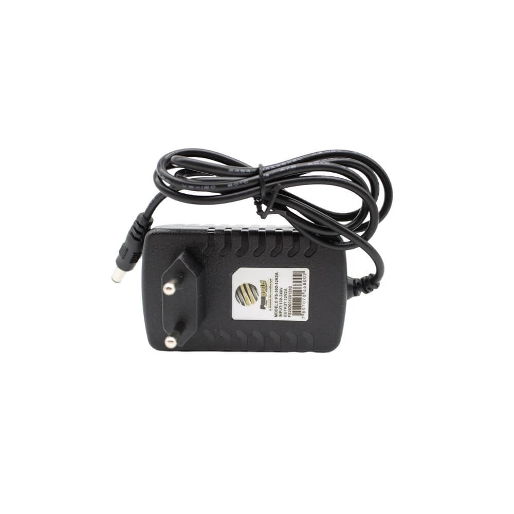 Fonte Fasgold FS459: 12.8V e 2A para energia estável. Possui cabo de 3 metros e pino, oferecendo praticidade e alcance.