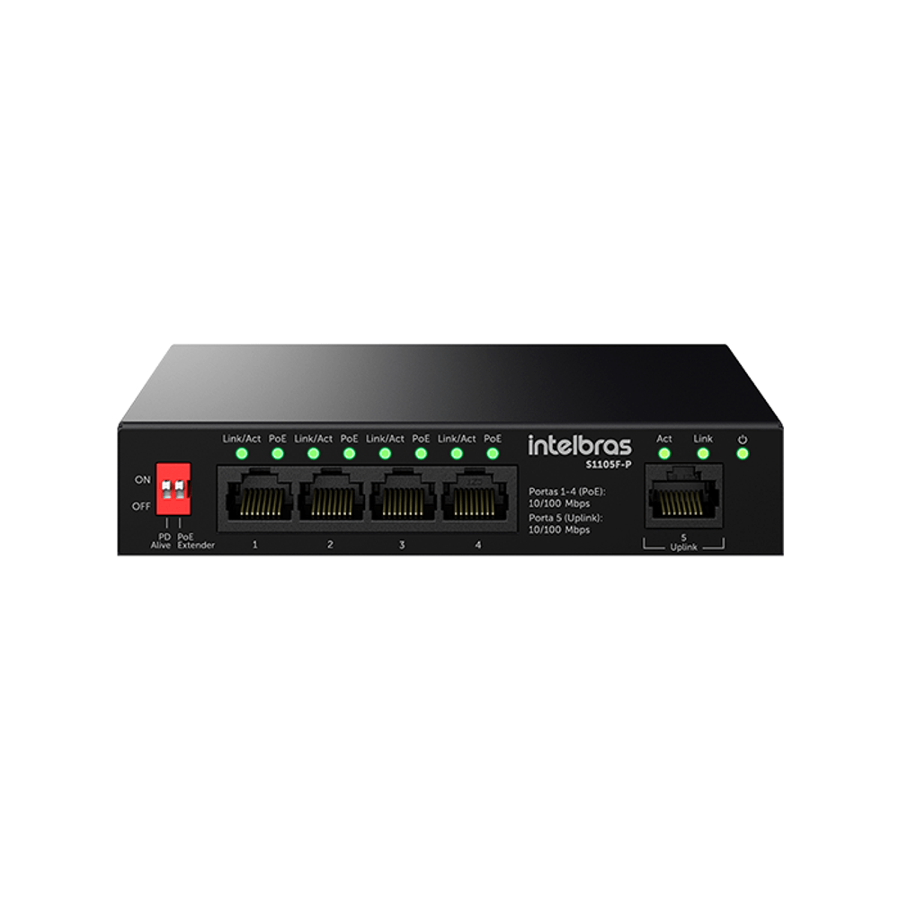 | Características do Produto | O switch S1105F-P possui 5 portas Fast Ethernet, sendo 4 delas com suporte à função PoE e 1 exclusiva para Uplink. Com a função PoE Extender é possível levar dados e energia elétrica para um dispositivo com até 250 metros de cabeamento para alimentar dispositivos IP, o que diminui os custos de instalação, melhora o desempenho de tráfego e garante ótima taxa de transmissão de dados. Além disso, com a função PD Alive o switch detecta travamentos e reinicia automaticamente a porta conectada ao dispositivo com falha. |