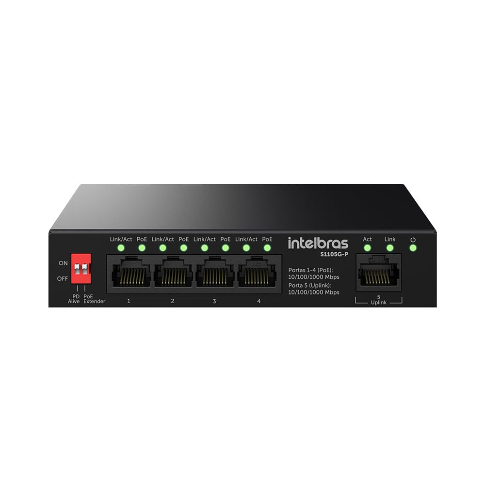 | Dados Técnicos | • Marca: Intelbras • Modelo: S1105G • Código do Produto: 4760119 • Tipo de produto: Switch • Tipo de gerenciamento: Não gerenciável • Quantidade de portas: 5 portas • Tecnologia das portas: Gigabit Ethernet • Velocidade das portas: 10/100/1000 Mbps • Formato / funcionalidade: Desktop • Instalação: Plug & Play • Suporte a PoE: PoE passivo • Porta PoE: LAN 5 • Alcance do PoE: Até 100 metros • Função QoS: Sim • Prioridade de QoS: Dados, Voz e Vídeo • Velocidade de transferência: Até 10 vezes superior ao Fast Ethernet • Design: Compacto • Ambiente de instalação: Desktop • Alimentação elétrica: Bivolt automático • Algoritmo de QoS: WRR (Weighted Round Robin) • Código NCM: 85176234 • Linha / coleção: Redes • Controle de banda: Sim • Ficha técnica disponível: Sim • Guia de instalação disponível: Sim • Uso recomendado: Redes locais, residências e pequenas empresas • Número máximo de dispositivos conectados: 5 • Dispositivos compatíveis: Computadores, rádios outdoor, roteadores e câmeras IP • Manual disponível: Sim |